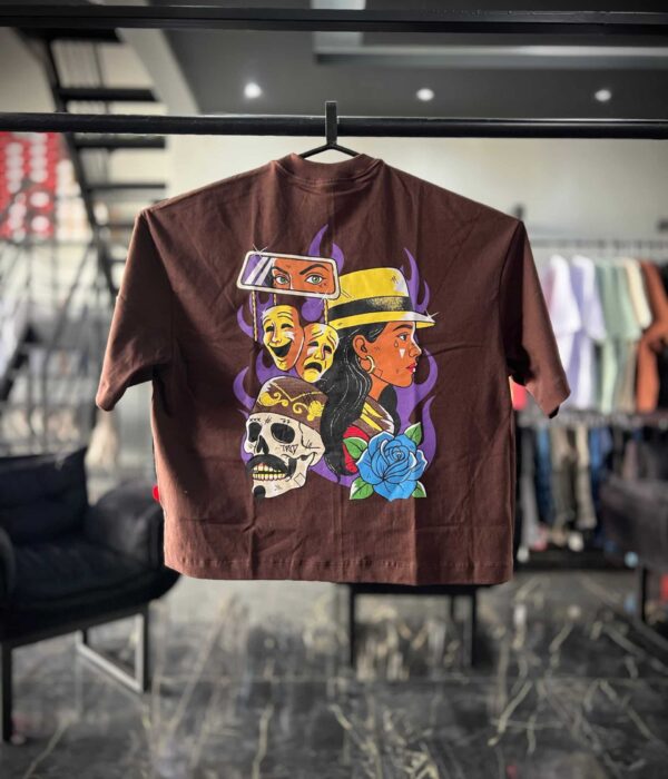 3x R$ 60,00 s/ juros R$ 153,00no Pix CAMISETAS G TRIP SID MARROM ESTAMPA ROSA/CAVEIRA